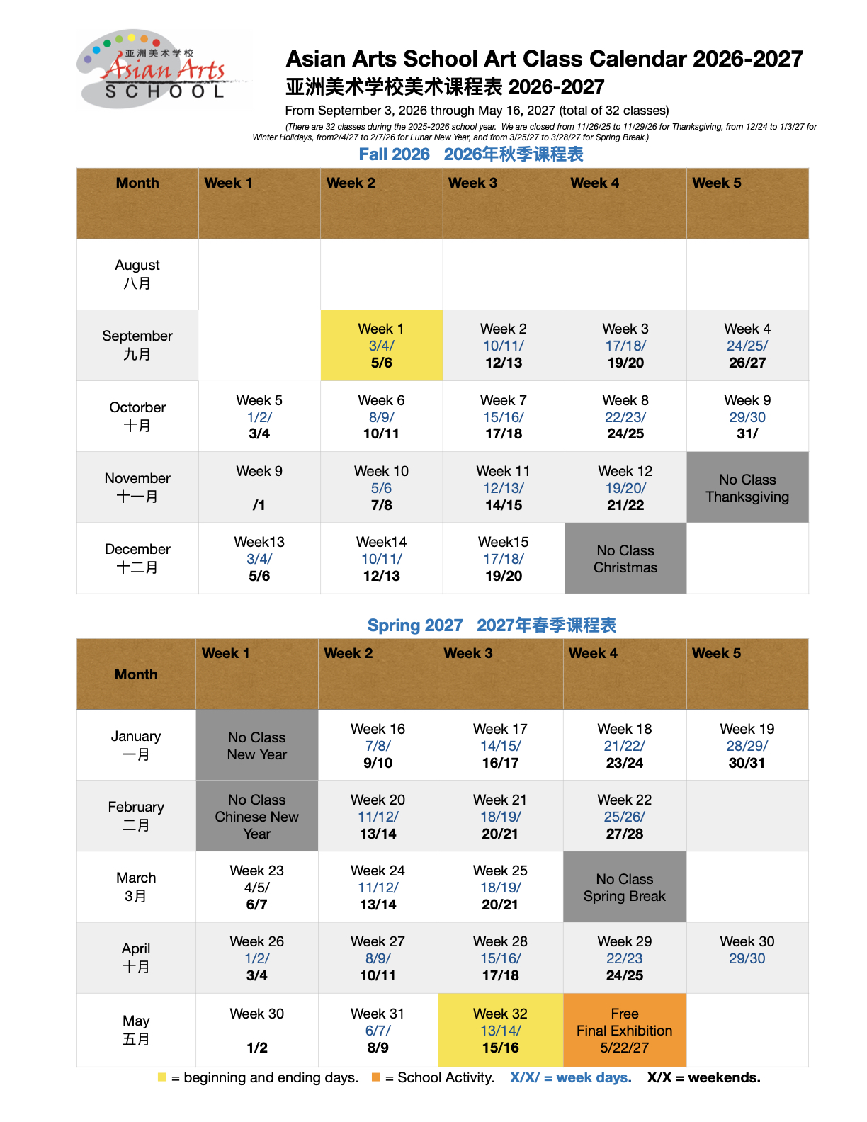 The 2026–2027 school year includes 32 classes, one free exhibition, and free art contests.